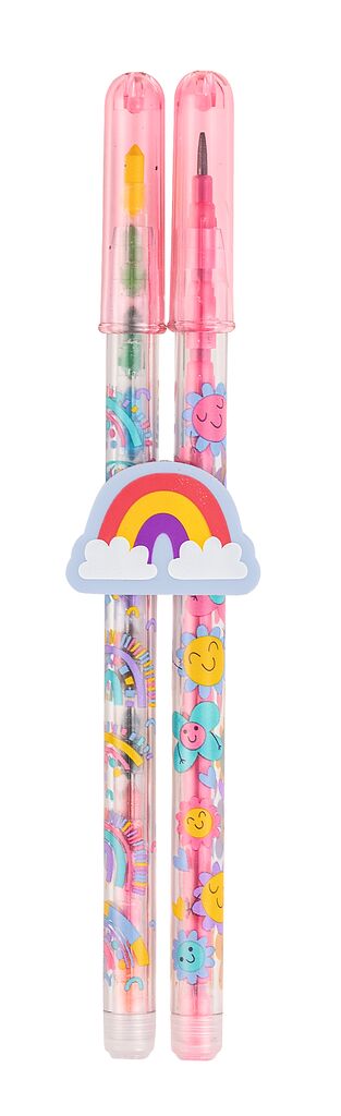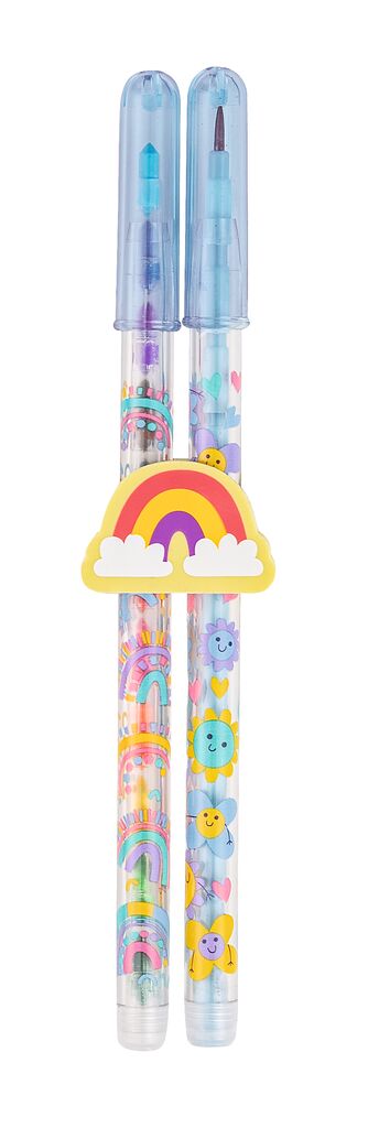 Rot – Orange – Gelb – Grün – Blau – Violett. Ein Regenbogen! Mit diesem praktischen Steckstift ist der nächste Regenbogen ganz einfach gemalt. Alle kunterbunten Farben sind handlich in einem Stift verstaut – einfach umstecken und weiterzeichnen. Kunterbunte Bilder in allen Farben des Regenbogens und farbenfrohe Kritzeleien lassen sich mit diesem Steckstift ganz einfach aufs Papier bringen! Die kleinen Künstler*innen haben aber nicht nur 11 verschiedene Farben, sondern auch einen Bleistift mit Steckminen, so ist kein Anspitzen mehr nötig! Und wenn doch einmal ein falscher Strich auf dem Papier gelandet ist, können sowohl Wachsmaler als auch Bleistift mit dem Regenbogen-Radiergummi ganz einfach wegradiert werden. Das Set lässt sich praktisch durch die Löcher im Radiergummi verstauen und spart außerdem Platz im Etui und auf dem Schreibtisch, denn statt einer ganzen Packung Wachsmaler wird selbst für knallbunte Bilder nur ein einziger Steckstift benötigt. Der Stift ist ideal für unterwegs, in der Schule oder als Geschenk für die Schultüte. Besonders praktisch ist die große Farbauswahl des Stiftes auch zum Ausmalen von Vorlagen in Malbüchern und eigenen Kreationen – der Fantasie sind keine Grenzen gesetzt!