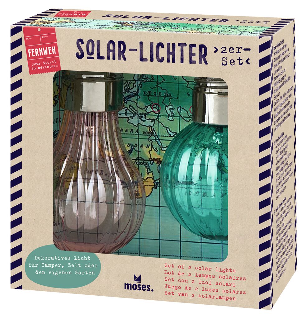 Ob nach einem langen Roadtrip, abends am Campingplatz oder bei der Sommerparty im heimischen Garten: Das Solar-Lichter-Set sorgt unterwegs und zu Hause für pure Wohlfühlstimmung! Die beiden Leuchten aus Kunststoff mit je einem LED-Lämpchen spenden warmweißes Licht – und das ganz ohne Steckdose. Der Akku der Solarlichter lädt sich automatisch per Sonnenlicht auf und schaltet sich ein, sobald es dämmert. Sowohl drinnen als auch draußen können die weiße und die hellblaue Lampe mit dem praktischen Henkel am Van, dem Zelt oder der Terrasse befestigt werden und sind ein wahrer Hingucker. Dank der Geschenkbox im schönen Fernweh-Design eignen sich die beiden dekorativen Solar-Lichter auch perfekt als Mitbringsel für Weltenbummler*innen und Camping-Fans.