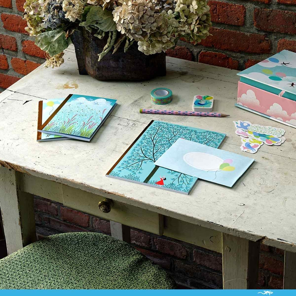 Inhalt: 1 bedruckte Schachtel mit herausnehmbarem Fach (22,5 x 18 x 6 cm), die 10 illustrierte Karten und 10 illustrierte Umschläge, 6 Bögen mit Abziehbildern, 5 Lesezeichen, 6 Stickerbögen, 1 Rolle Masking-Tape, 1 Bleistift, 1 Radiergummi, 2 kleine linierte Hefte und 1 großes liniertes Heft enthält.