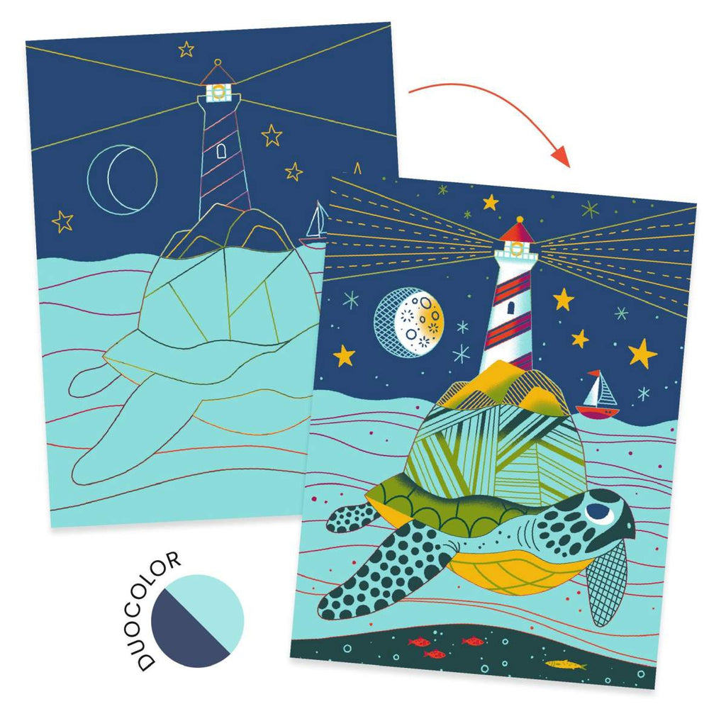 Inhalt: 4 Kratzbilder (15 x 20 cm), 1 Holzstift mit doppelter Spitze, 1 bunte Schritt-für-Schritt-Anleitung.