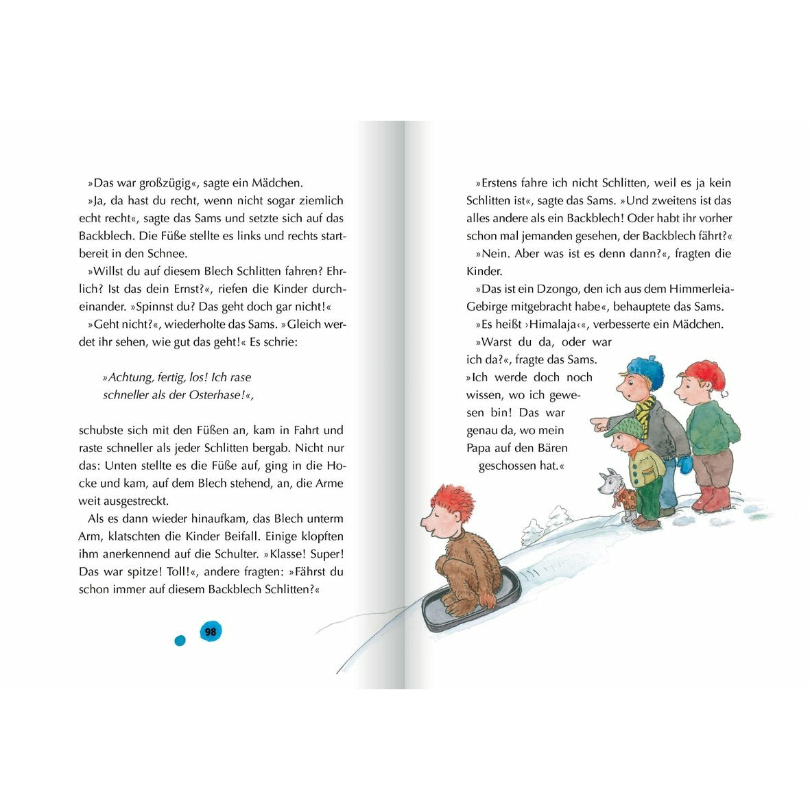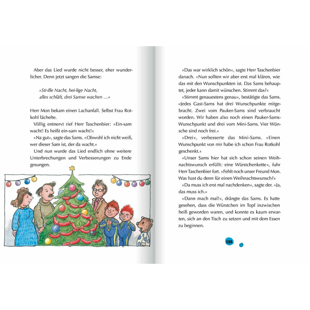 Für das Sams ist es das erste Weihnachten bei Herrn Taschenbier. Um genau zu sein: Es ist sogar sein allererstes Weihnachten überhaupt! Kein Wunder, dass es sich mächtig wundert: Wer sind diese kleinen Flügelwesen, die angeblich im Himmel herumschweben? Weshalb muss Papa Taschenbier ständig Geheimnisse haben, obwohl das Sams ganz fürchterlich neugierig ist? Und warum stellt man sich plötzlich Bäume ins Wohnzimmer, wenn sie doch sonst das ganze Jahr über draußen bleiben müssen? Wie gut, dass an Weihnachten so viel gesungen und gereimt wird, damit kennt das Sams sich aus!