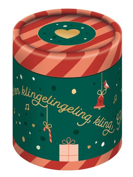 Die Gutschein-Spieluhrdose verbindet festliche Stimmung mit einer liebevollen Geschenkidee. Im integrierten Geheimfach finden Gutscheine oder kleine Geldgeschenke stilvoll Platz. Einfach aufziehen – schon erklingt eine der klassischen Melodien "Kling, Glöckchen" oder "O Tannenbaum" und sorgt für weihnachtliche Vorfreude. Das festliche Design mit glänzender Goldfolienveredelung macht die Dose zu einem echten Blickfang.