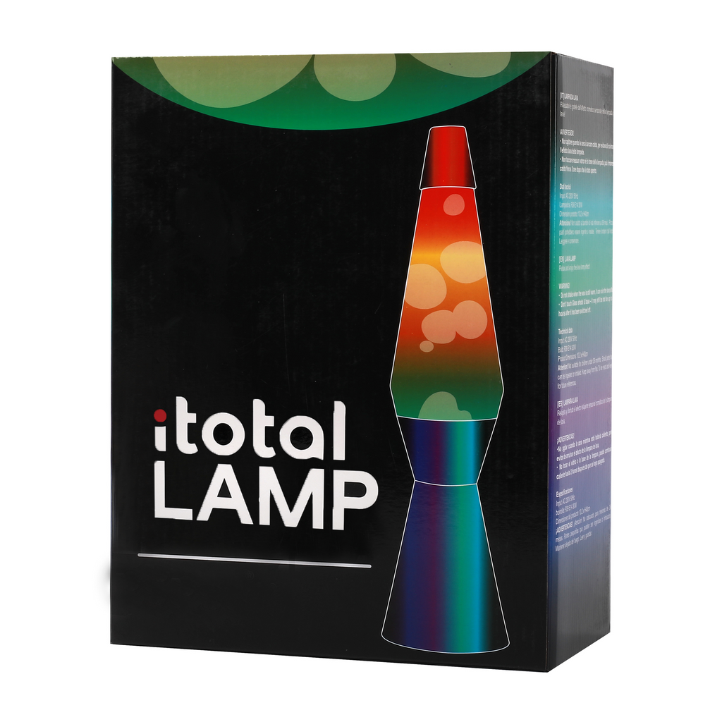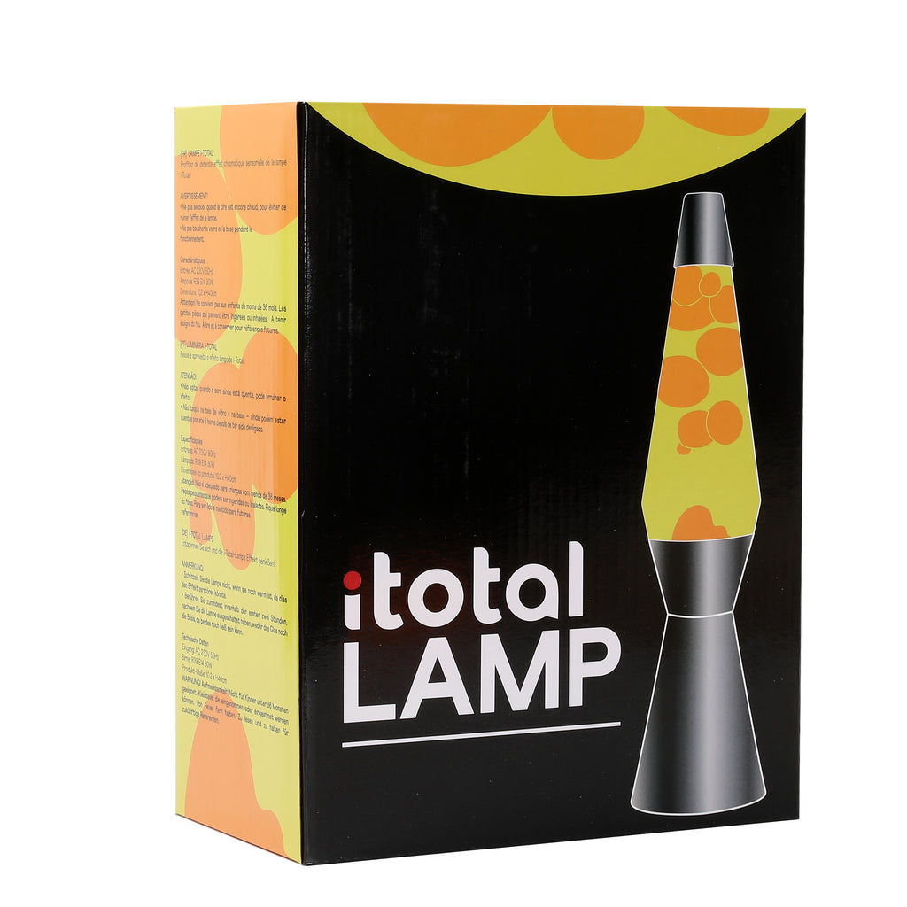 Spaceship Lavalampe mit silberfarbenem Sockel, gelber Flüssigkeit und orangefarbenem Wachs
