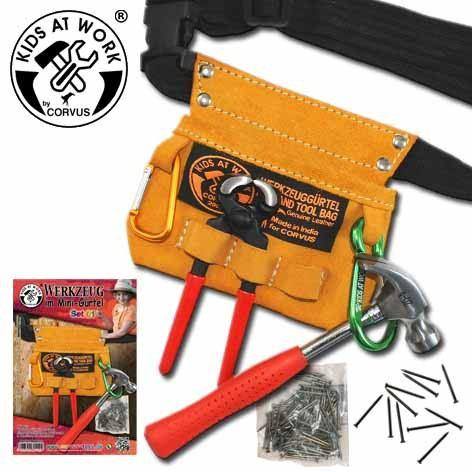Werkzeuggürtel aus Leder mit einem Bankhammer, einer Tasche mit Nägeln, einem Zollstock, einem Zimmermannsbleistift, einem Paar Handschuhe und zwei Hummerverschlüssen zur Befestigung anderer Werkzeuge am Gürtel.