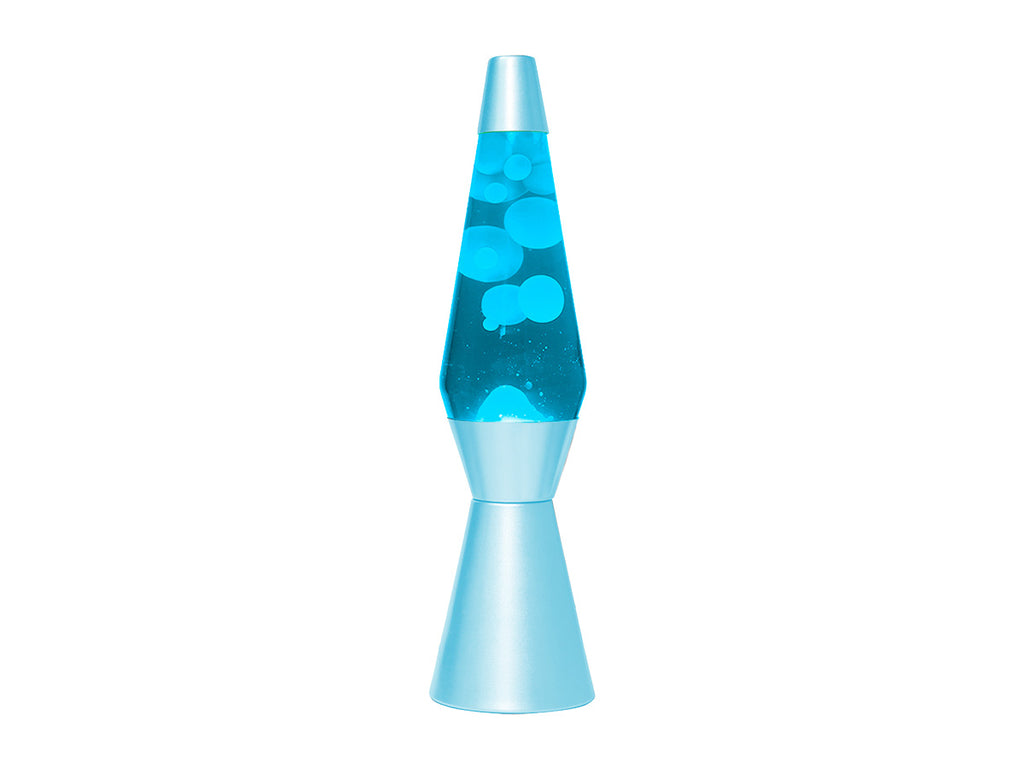 Spaceship Lavalampe mit blauer Sockel, blauer Flüssigkeit und weißem Wachs